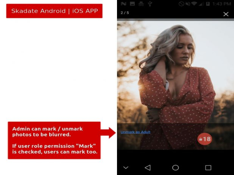 Oxwall, Skadate iOS, Android and Progressive Web App fully compatible. User Credits Compatible. Protect photos based on user roles. Blur photos and user Avatars. Users can mark their Photo as "adult" or private. User role based, all photos marked as "adult" or NSFW(Not Safe For Work) or private will be seen by the owner, admin and the users from certain role, for example VIP only.