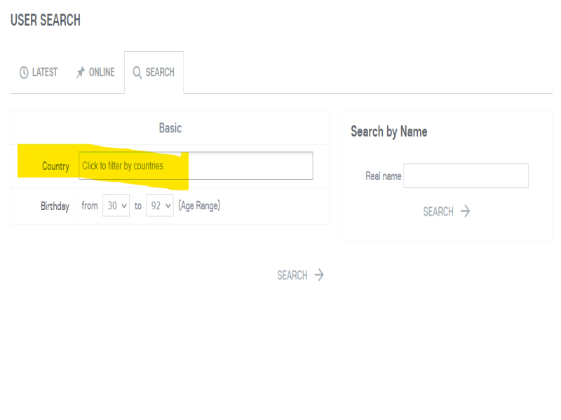 Show user country flag. Searchable from member search page.